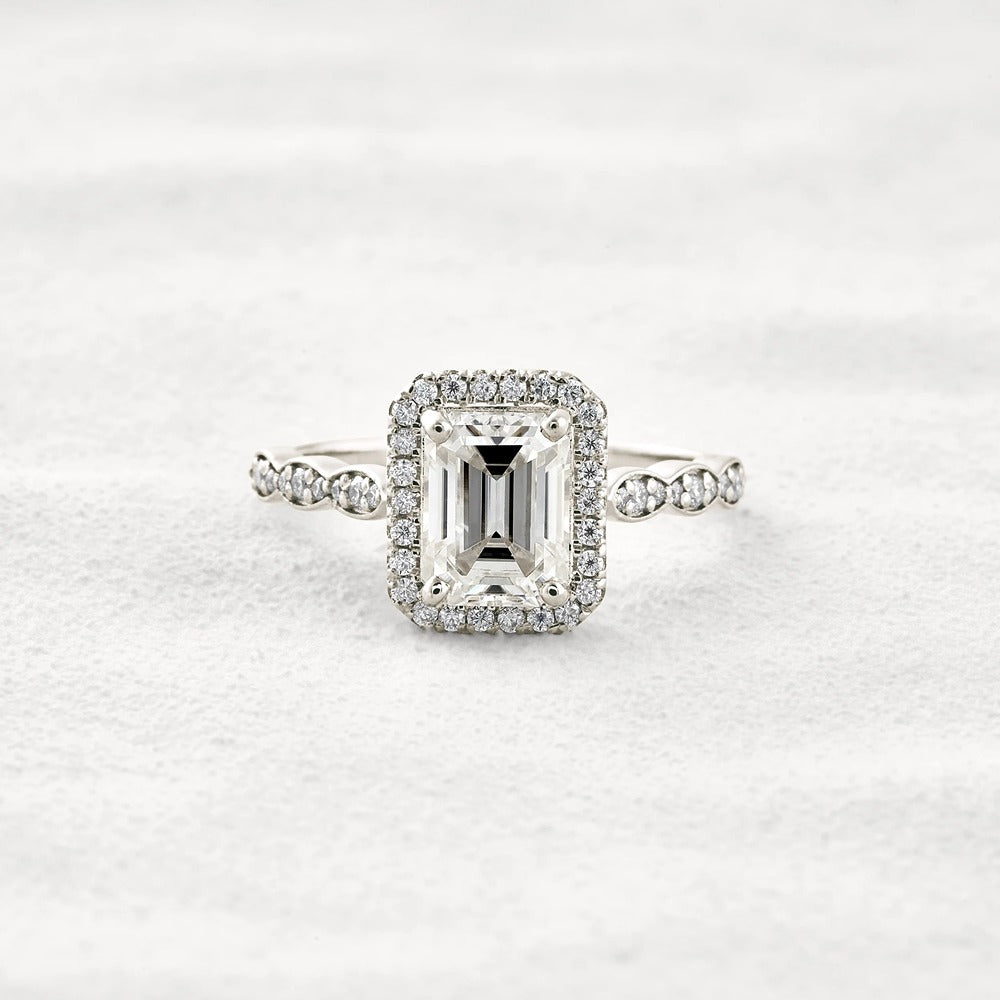 Moissnaite Emerald Cut Halo & Pave Set Engagement Ring
