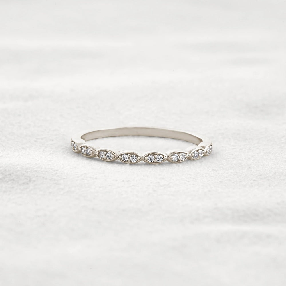 This beautiful band is made of 14k, 10k and 925 sterling silver. Moissanite diamonds are used in this band. The diamond setting is in a prong. Which can fit into any type of band.