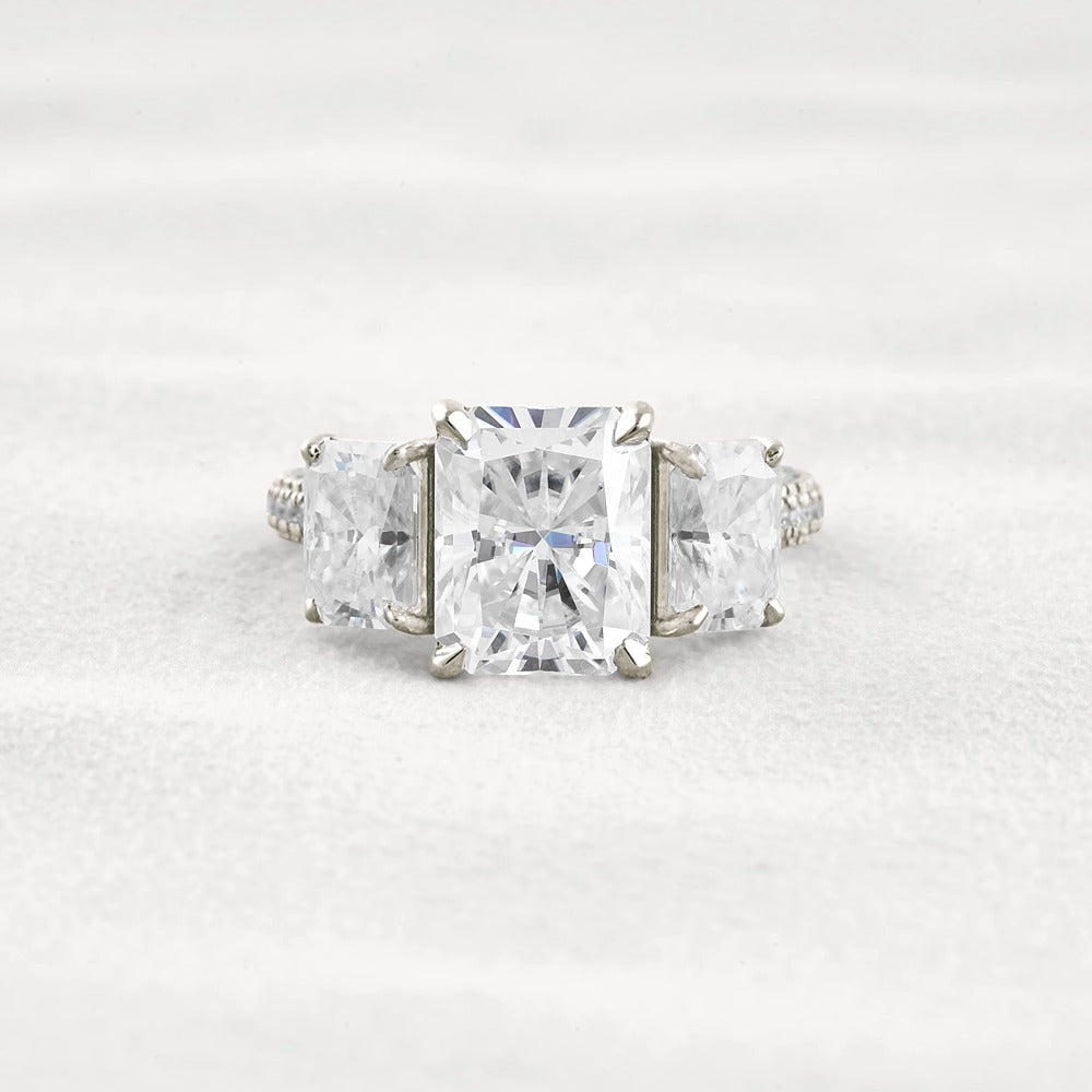 Radiant Cut Three Stone & Pave Set Moissanite Diamond Ring